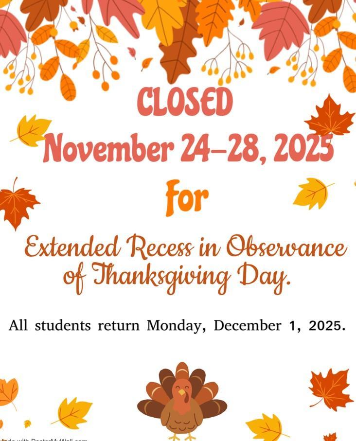 School Closed in Observance of Thanksgiving Day / November 24-28, 2025